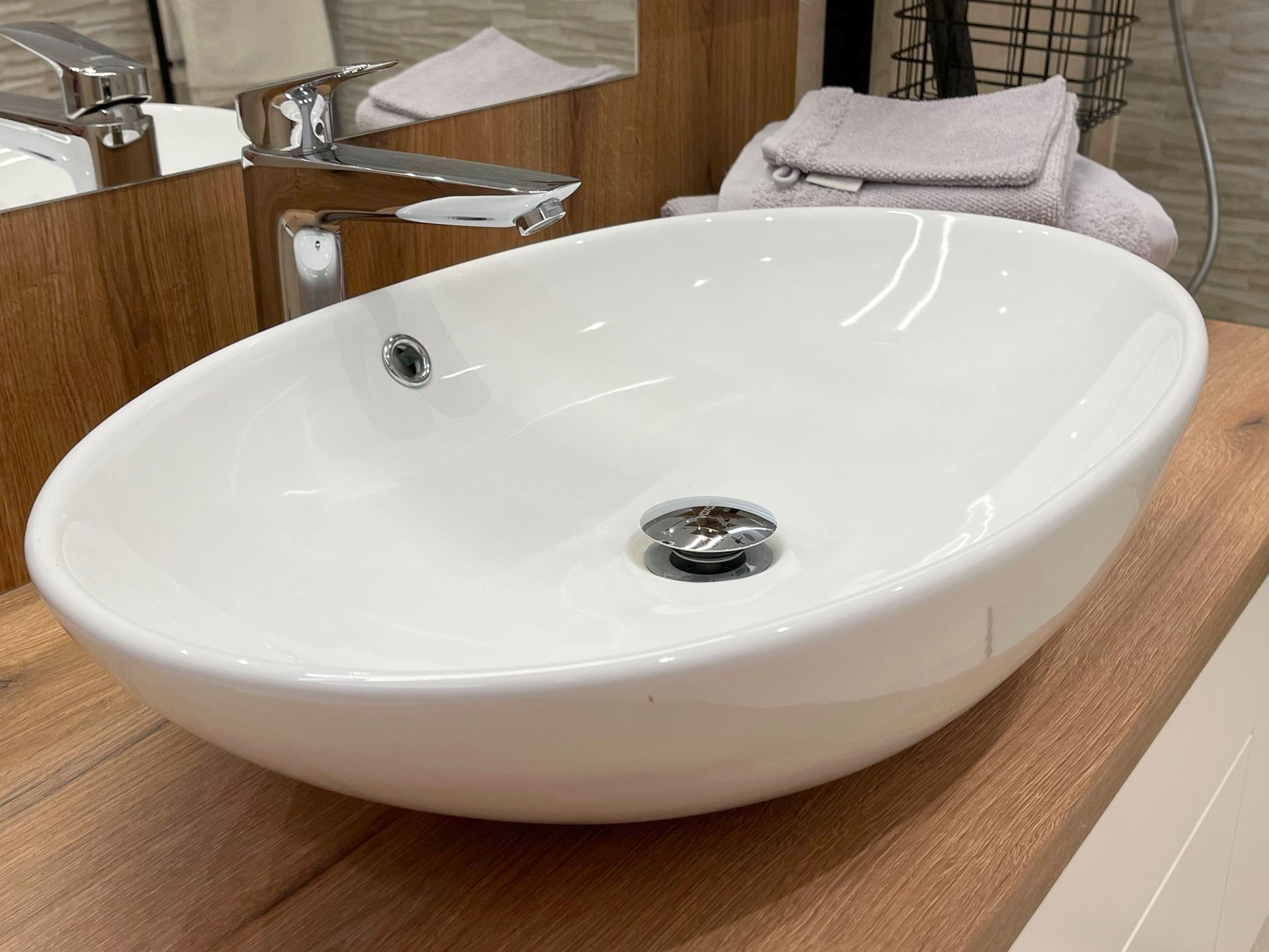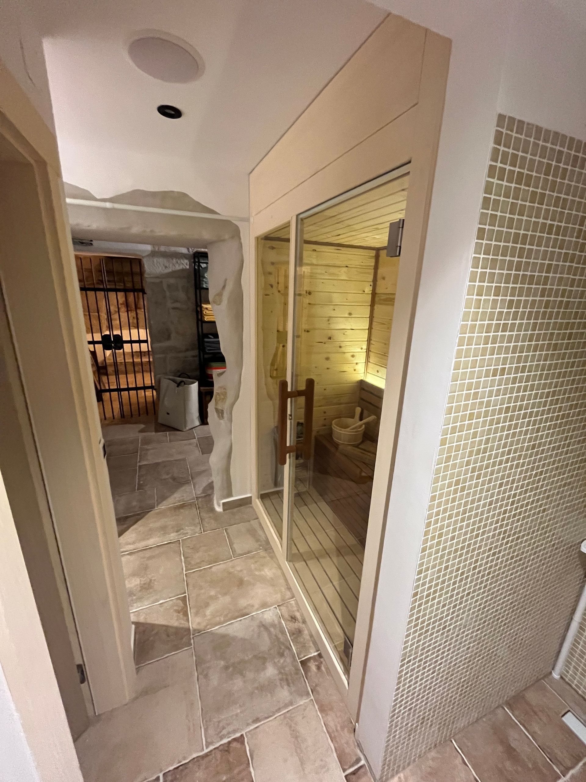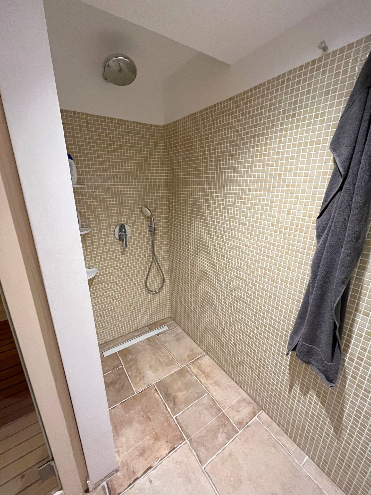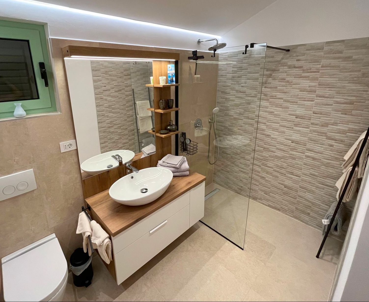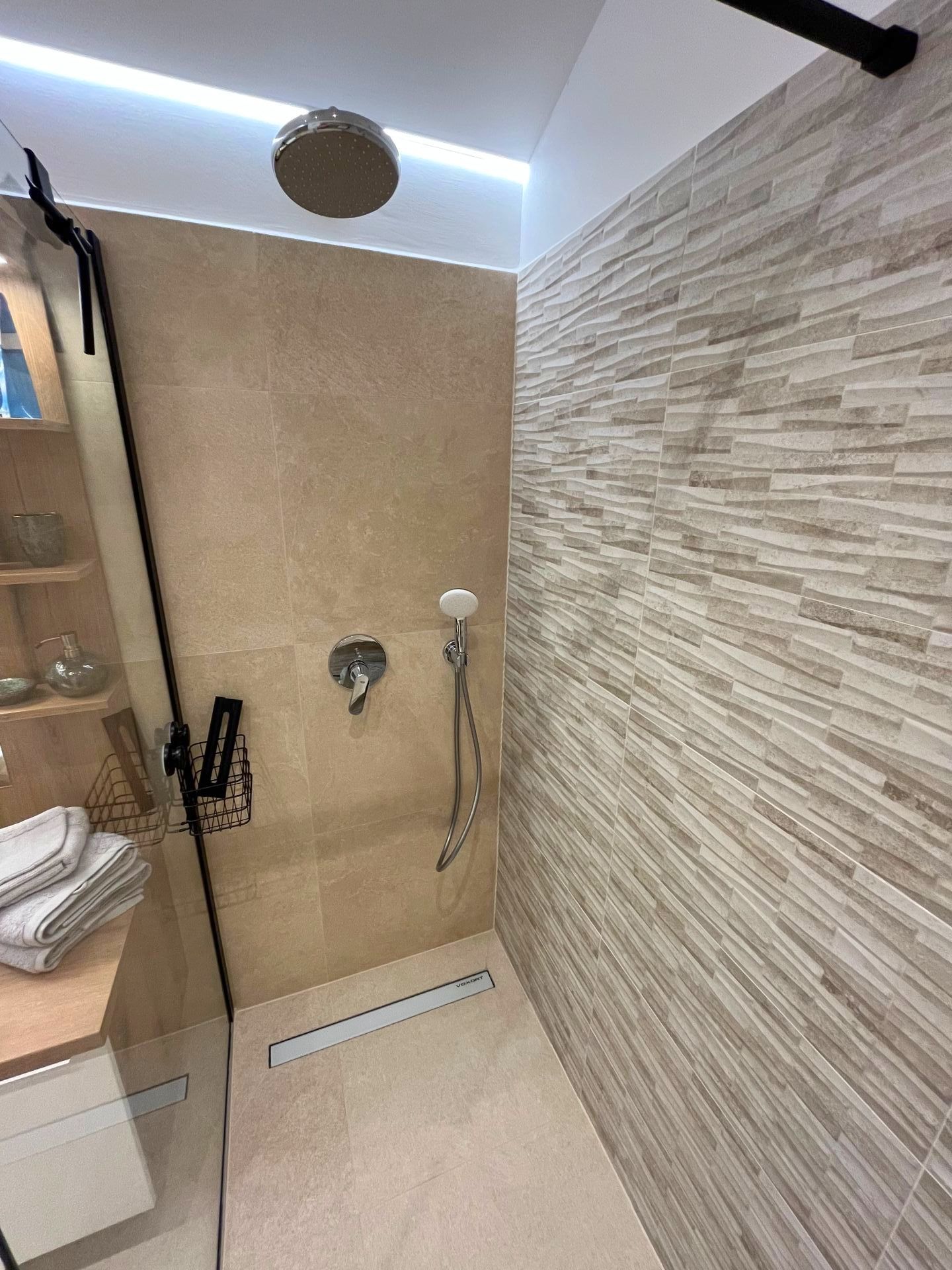 - Badezimmer mit begehbarer Dusche, Waschtischeinheit, Spiegel, WC, Fußbodenheizung, inkl. Hand - und Duschtücher, Föhn